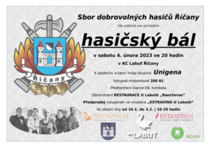 Držíme tradici. Opět pro Vás připravujeme hasičský ples. Srdečně Vás zveme na náš další ročník hasičského plesu. Datum konání: 4.2.2022 Kde? Kulturní centrum Labuť Říčany Kdo hraje? Kapela UNIGENA Přijďte