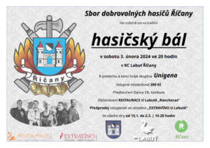 Sbor dobrovolných hasičů Říčany Vás všechny srdečně zve na další ročník tradičního plesu SDH. I letos se můžete těšit na bohatou tombolu nebo skvělou kapelu Unigena. Občerstvení zajistí restaurace U
