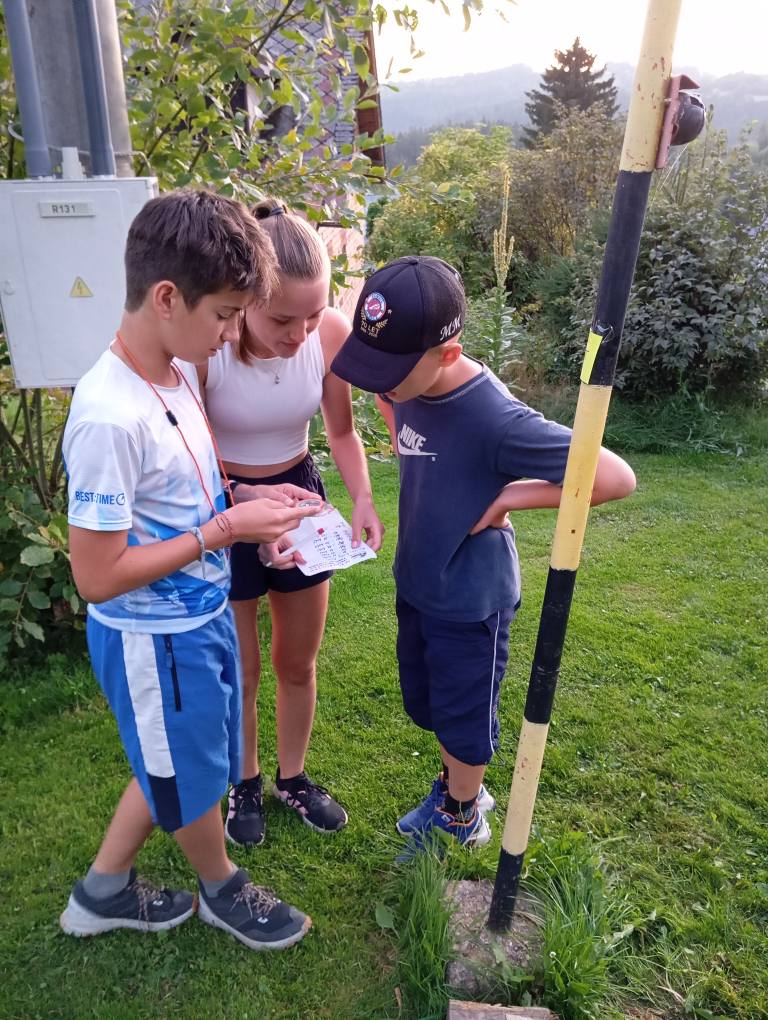 Každý svojí kartu, mapa na stole, body rozmístěny kolem penzionu a všichni makají vše oběhnout a zaškrtat Každý v nohách poctivých horských 6km a pak už bazén za odměnu