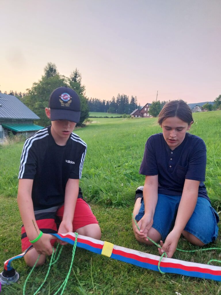 První den obvykle začínáme obědem a pak už na nás čekal program – soutěž v používání radiostanic , výroba týmových vlajek a vymýšlení pokřiků a samozřejmě nácvik pořadové přípravy