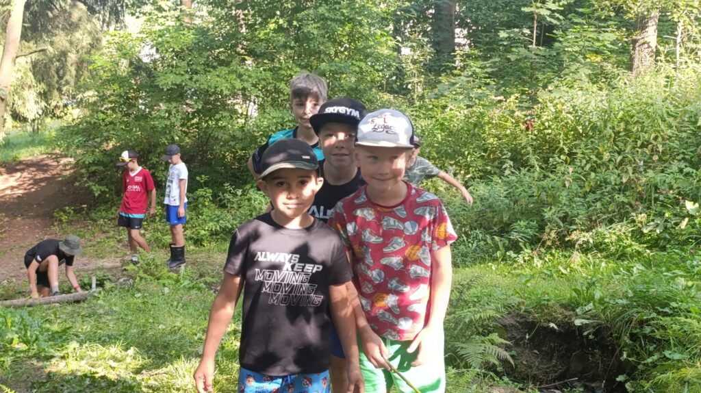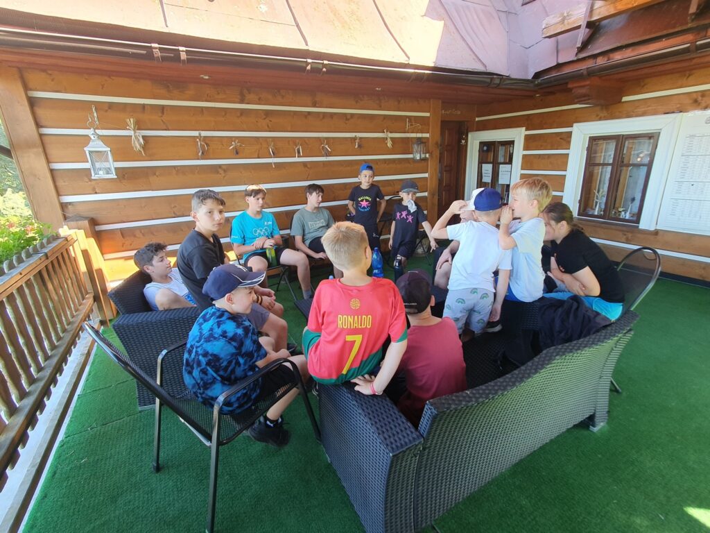 Po bazénu obídek…a pak? Ticho Spí celý Penzion Dobře, chápeme… Odpoledne už musí být odpočinkové. Takže po siestě si mladší splní zkoušky z odborností a starší jdou pro dříví na táborák. Pak chvilku pohrát u potoka a jdeme péct buřtíky a Marshmallouny Posezení u ohně, písničky a povídání ukončí náš 5.den… Dobrou noc